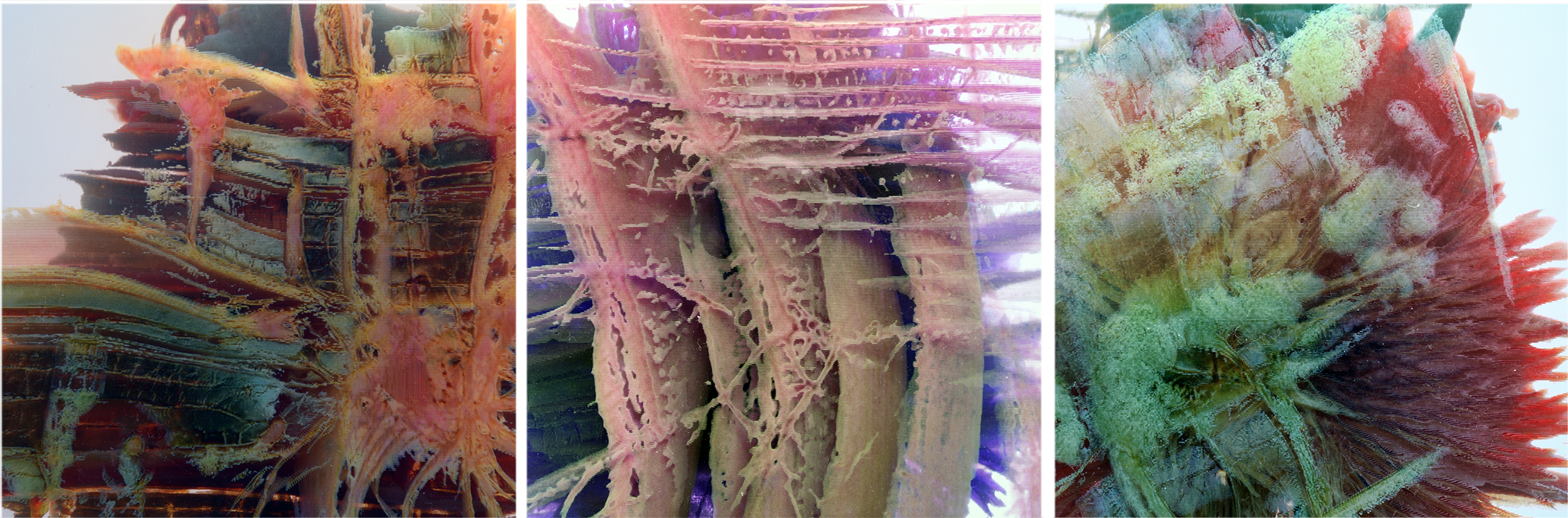 Selected sequences from this latent walk were then translated directly into voxel data for PolyJet printing. Instead of modeling form through conventional geometry, each frame became an ultra-thin bitmap slice in a vertically stacked print sequence, with color, opacity, and material variation resolved through voxel-level dithering and multimaterial deposition at the printer’s native resolution. Voxel printing has been described as a way of fabricating data directly across volumetric space, and in Coalescence that capacity becomes epistemic as much as technical: once the latent walk is stacked into depth, the object no longer reads as a single image but as a condensed section through many possible spatial states. What usually remains hidden in computation—the gradual transitions, compressions, and latent affiliations within the dataset—emerges here as density, blur, translucency, and internal spatial interference.